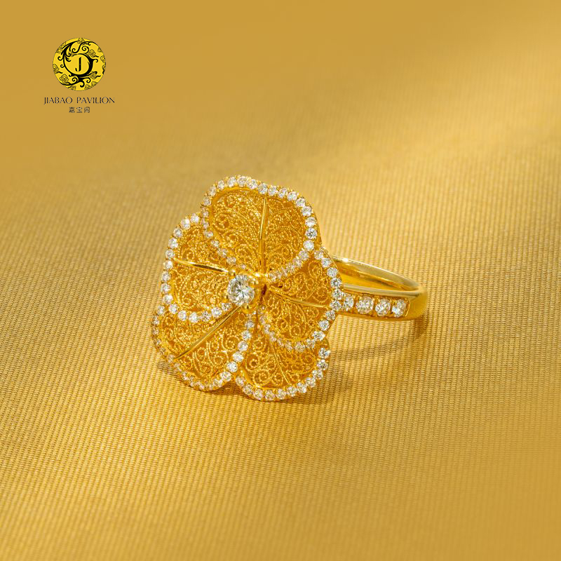 【夏系列】夏荷元素層層疊蓋的立體設計,融合花絲工藝編織而成荷葉的脈絡,再以鑽石點綴象徵荷葉上的露珠,讓人有種夏日綠意盎然、水波粼粼的感覺。